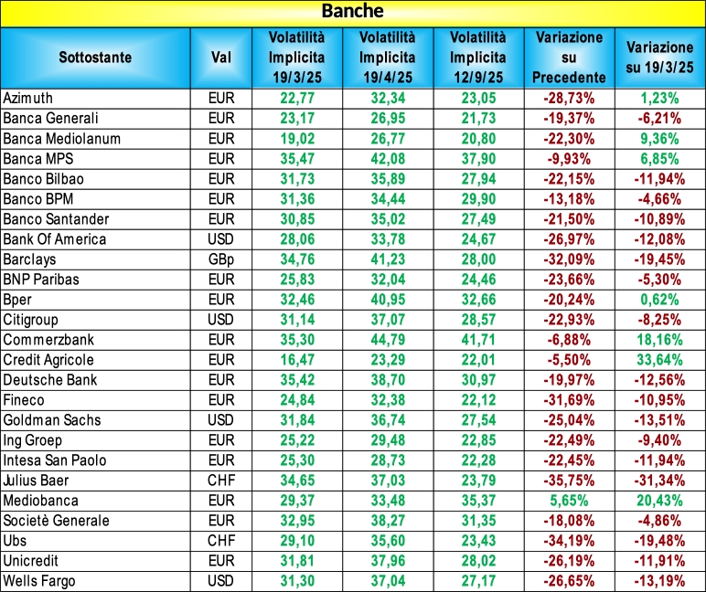 Per capire come sta andando il mercato e cosa è successo negli ultimi mesi, riporto anche la variazione di volatilità implicita dei sottostanti. È evidente che una volatilità in crescita implica maggiori variazioni dei prezzi (tipicamente in discesa) e calo del valore dei certificati, ma anche possibilità per gli emittenti di emetterne di nuovi a condizioni più favorevoli (payoff maggiore) per noi risparmiatori. Questo sulla carta… ma tutto sommato anche nella realtà, dai 😊.