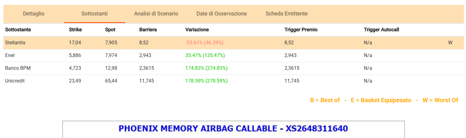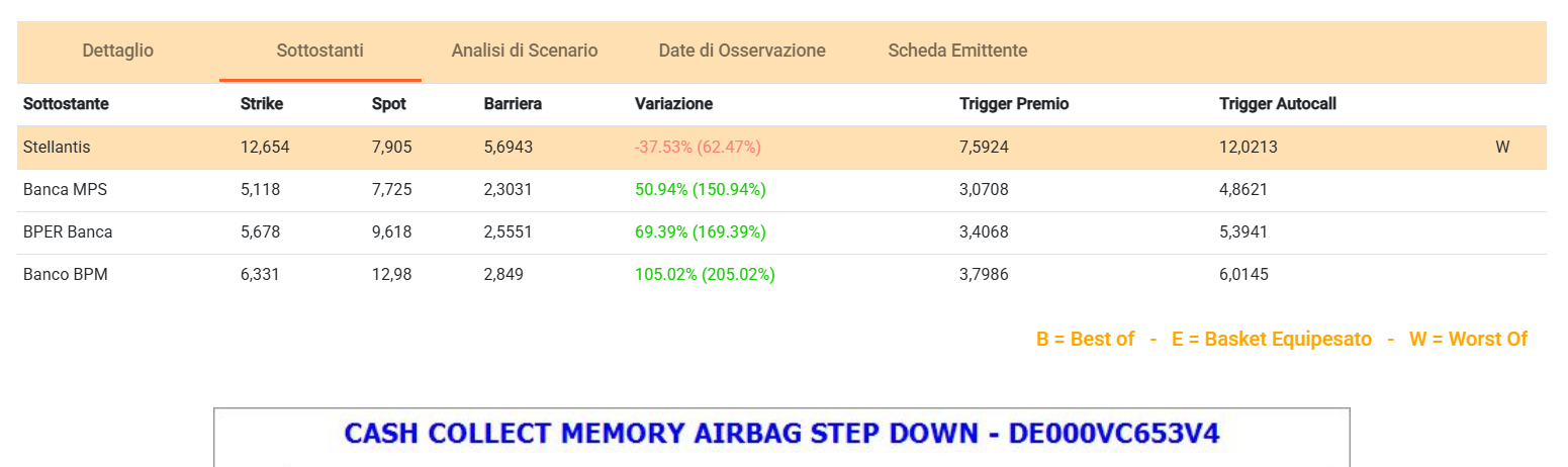 Prendiamo ad esempio, il Vontobel DE000VC653V4 Barriera Capitale 45% Barriera Cedola 60% Airbag 60 con sottostanti Bper, Banca MPS, Stellantis (WO a -37,5%) e Banco BPM. Ecco, questo certificato è “impicciato” assai: