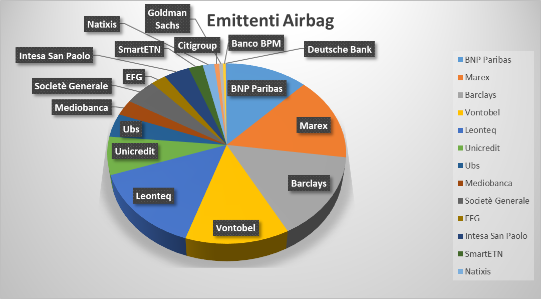 Di questi, 148 sono Callable (quasi tutti di Leonteq, EFG e BNP Paribas come era facile aspettarsi). Dalla tabella si vede come in questo caso i maggiori 6 emittenti di certificati a capitale condizionatamente protetto si dividono il mercato degli airbag in maniera quasi paritaria; non c’è quindi un emittente driver di mercato per questa tipologia di certificati.