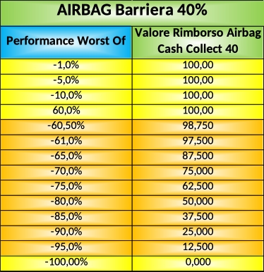 Struttura che già conosciamo e che è stata molto ben accolta dal mercato: AIRBAG (Low Strike) 40%, flusso cedolare 1% al mese, Autocall.