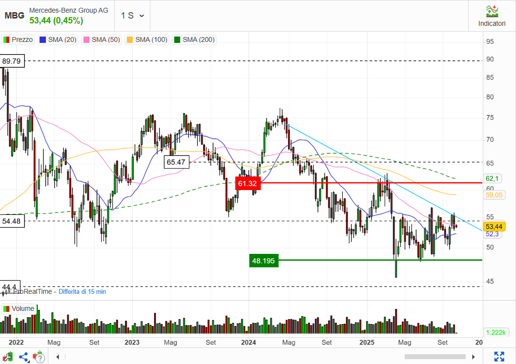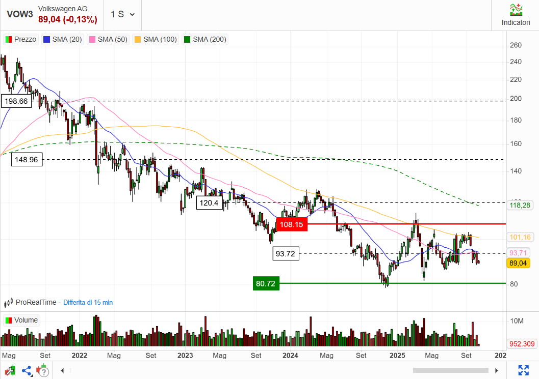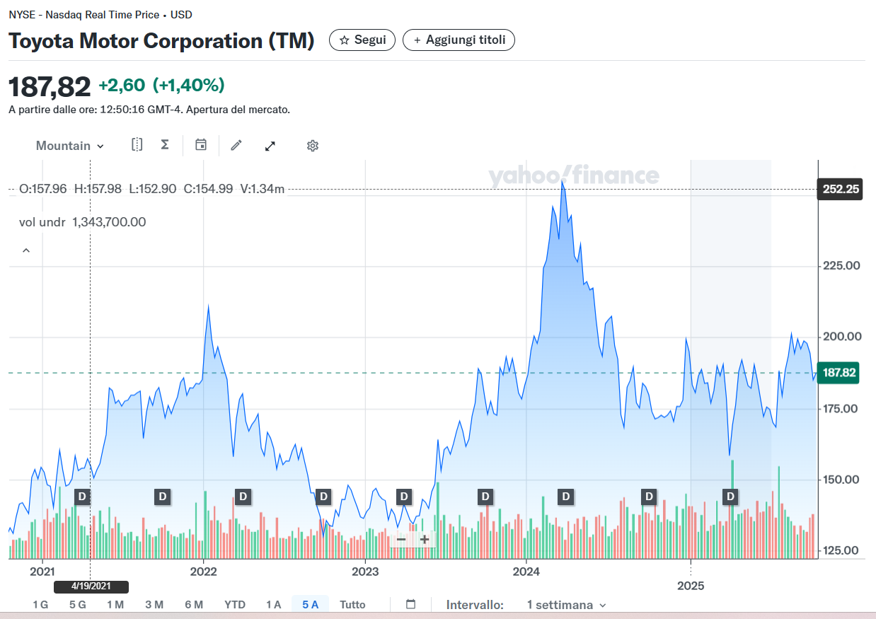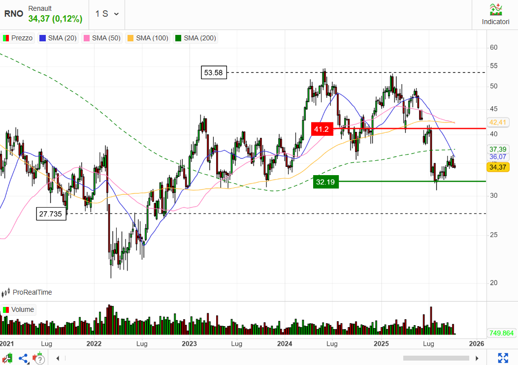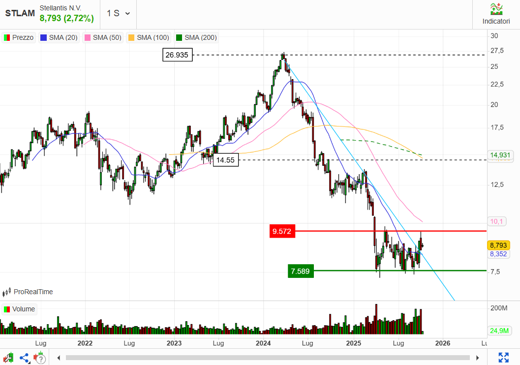 Il titolo durante l’anno ha toccato un minimo di 7,67 euro l’11 aprile 2025, dopo l’inizio della ben nota questione dei dazi. Ma non è quella la sola causa della discesa del titolo: è un bel po’ che di auto se ne vendono poche e il lauto dividendo staccato dal titolo di sicuro non ha aiutato. Infatti, il minimo di medio periodo è stato poi ritoccato il 10 settembre 2025 (7,47 euro).