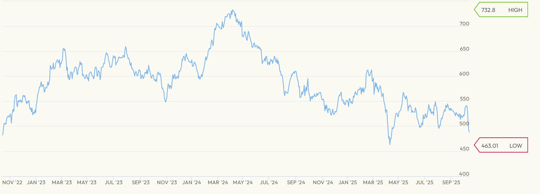 Il drawdown c’e stato ma dal massimo di 732,80 dell’8 aprile 2024 al minimo di 463,01 del 9 aprile 2025 parliamo di 36,8 punti, circa la metà del drawdown di Stellantis!