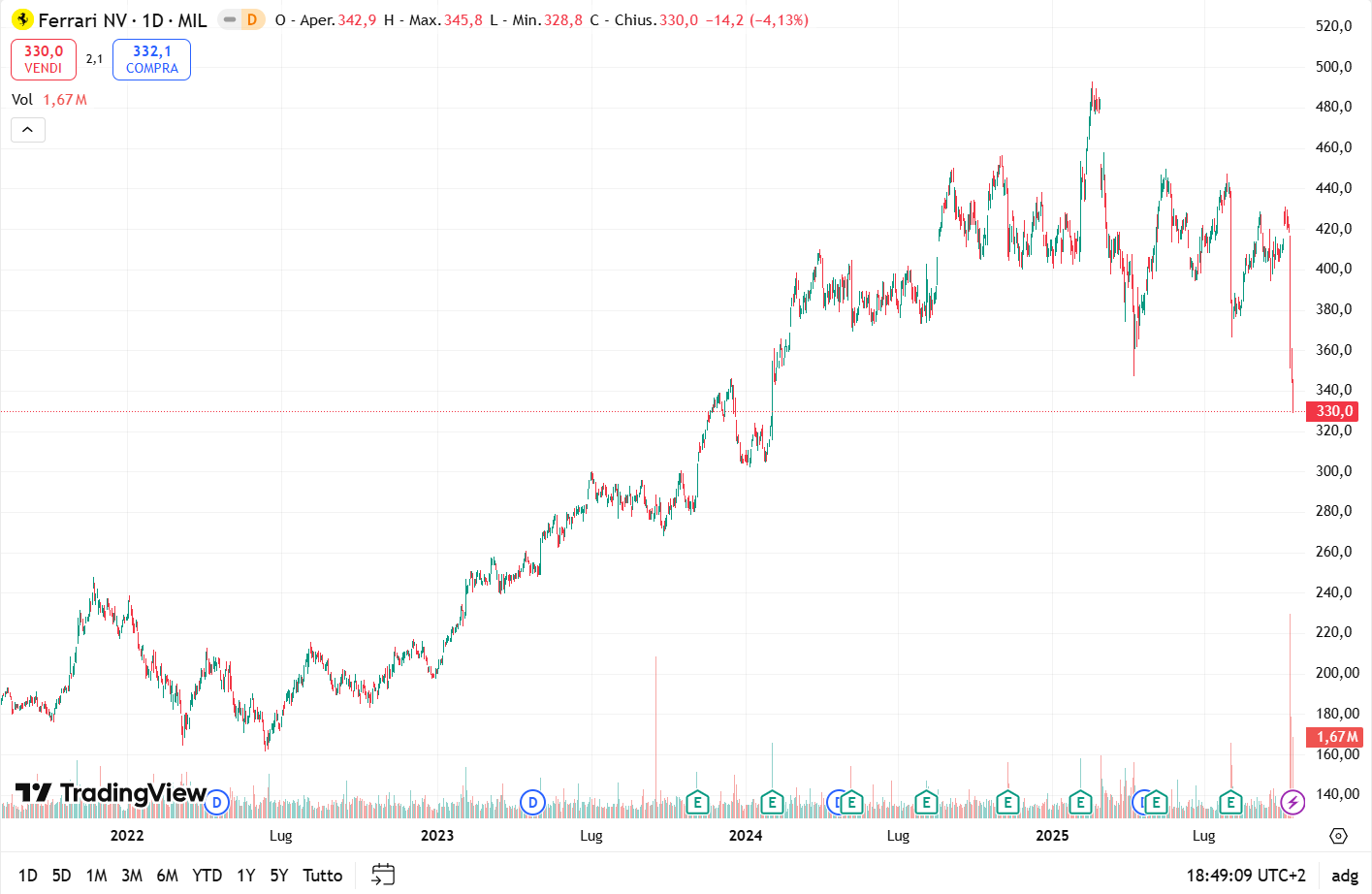 Unico titolo in controtendenza… fino a questa settimana? Ferrari! Vediamo il grafico:
