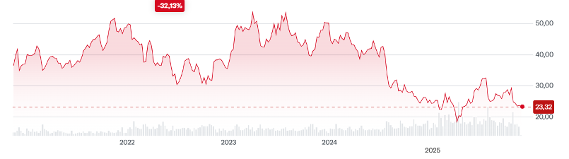 - 2025: forte discesa, con minimi a €15,76 e massimi a €28,41. Il titolo ha perso oltre il 40% dai picchi di 2023-2024.