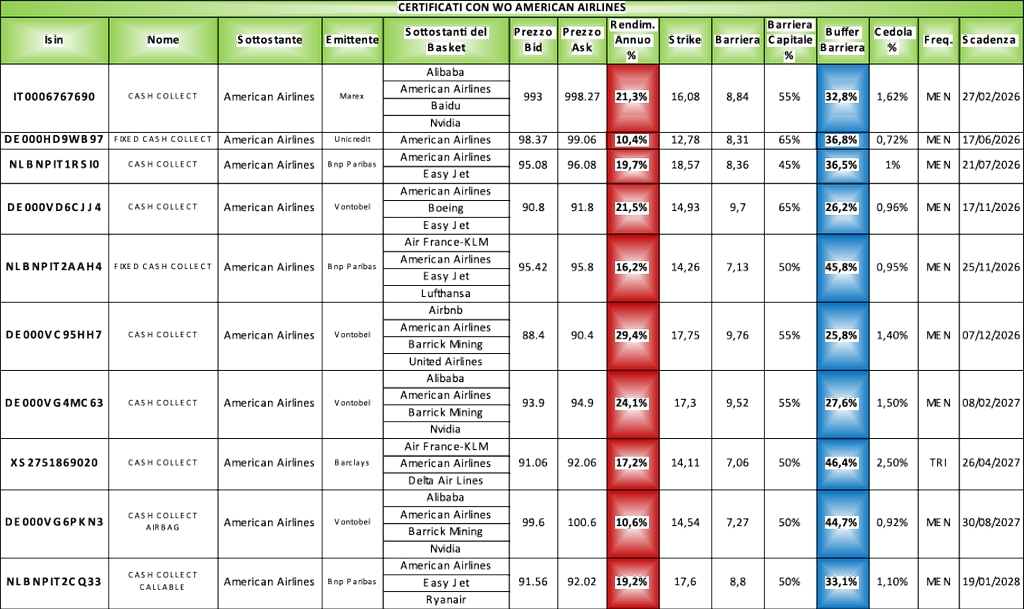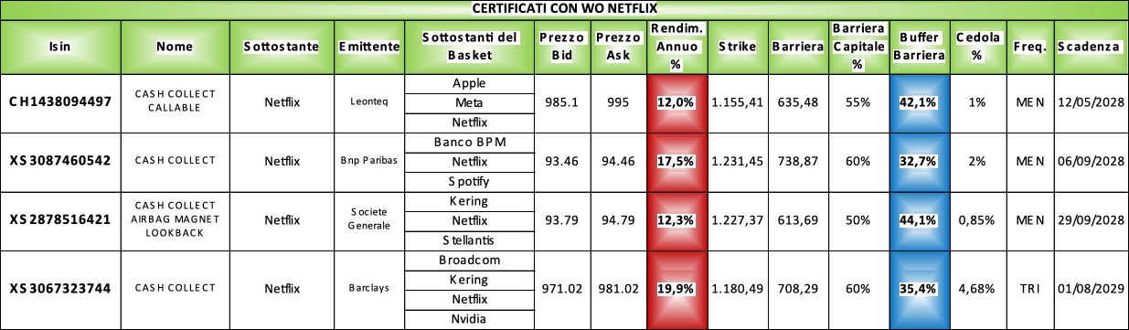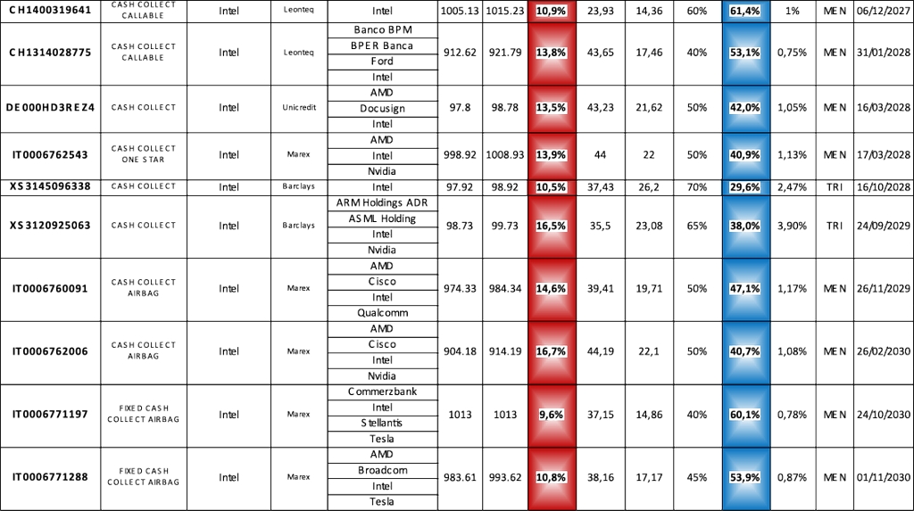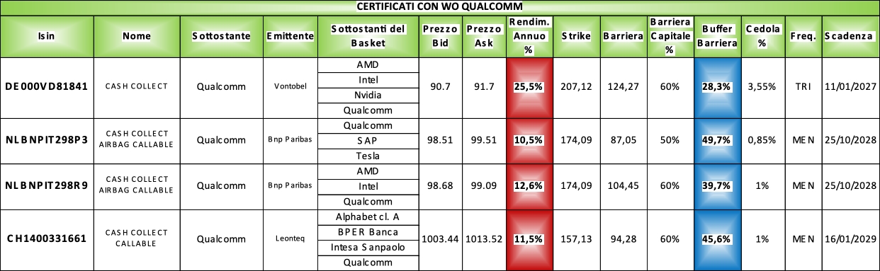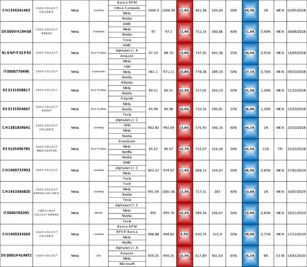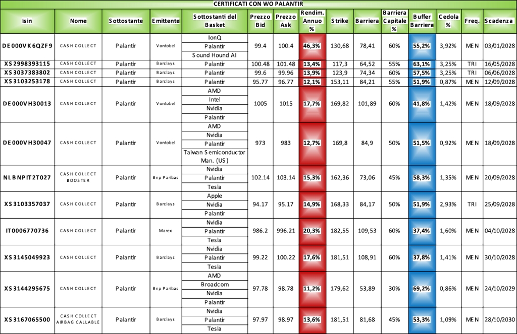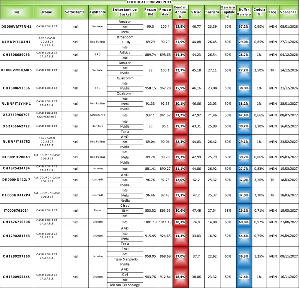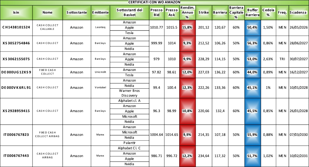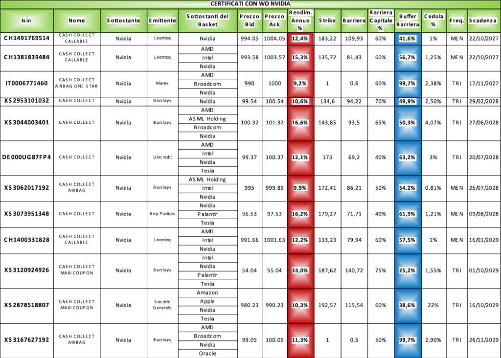 Le tabelle complete Stock picking USA le potete trovare Qui (link al file excel) in cui come sempre i certificati sono elencati per scadenza crescente, con il buffer barriera in blu e il rendimento annuo in rosso ricalcolato sulla base dell’ask di venerdi 7 novembre 2025.
