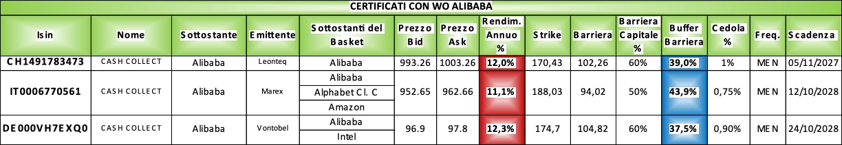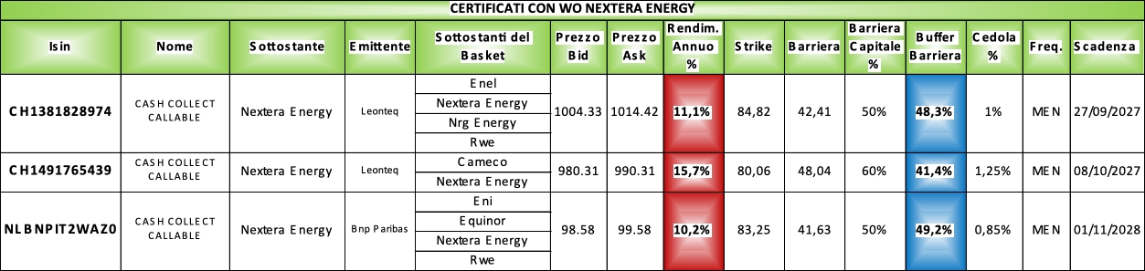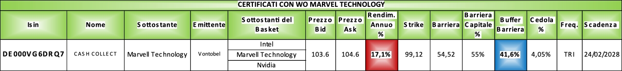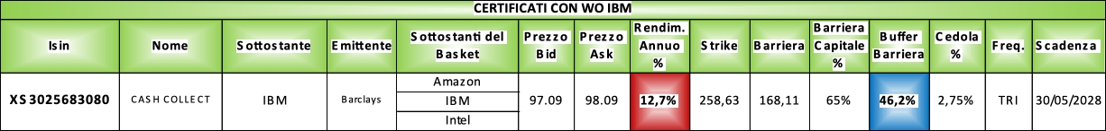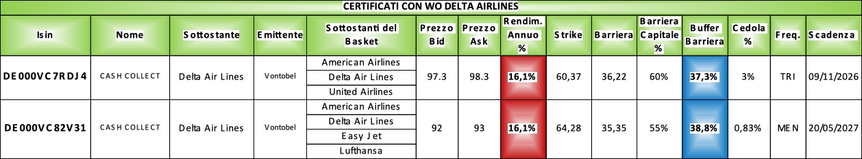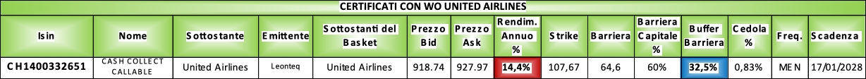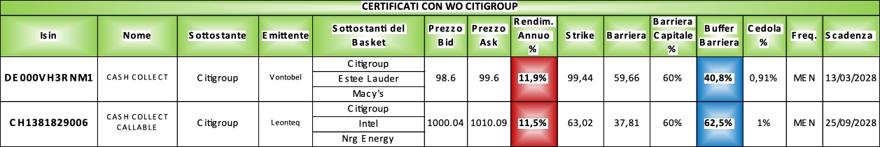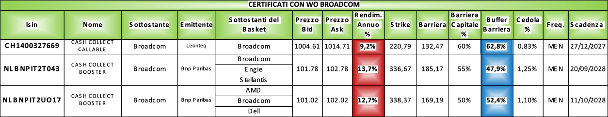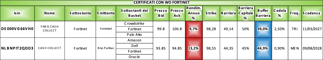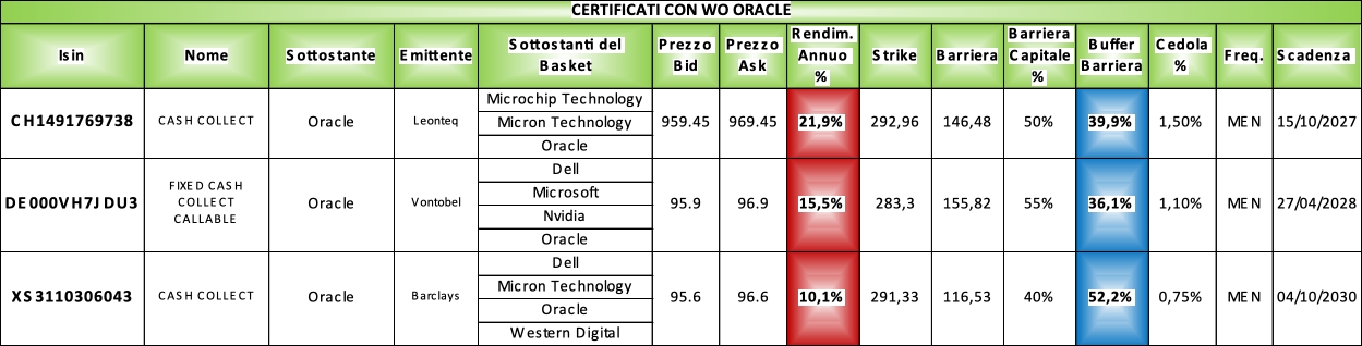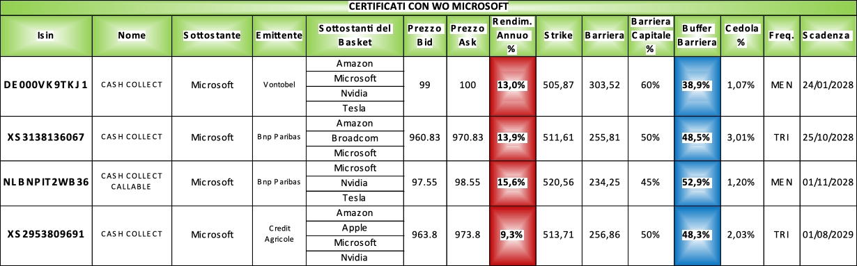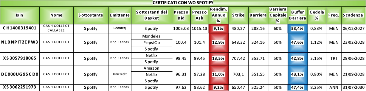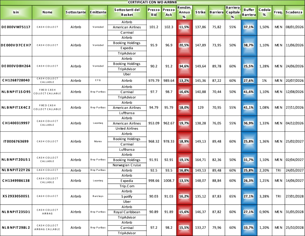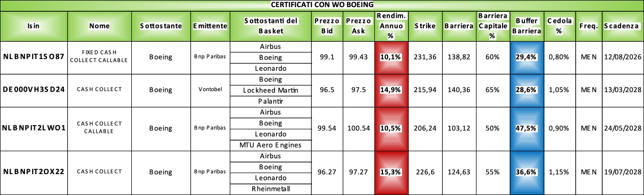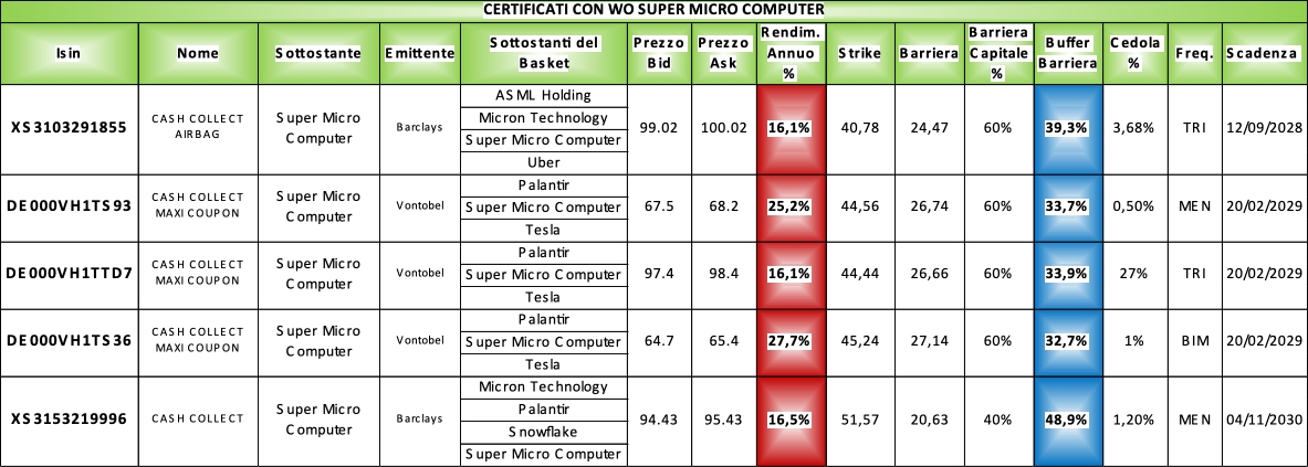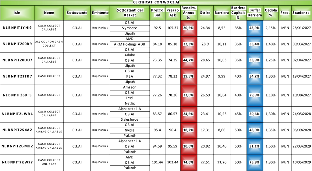 Le tabelle complete Stock picking USA le potete trovare Qui (link al file excel) in cui come sempre i certificati sono elencati per scadenza crescente, con il buffer barriera in blu e il rendimento annuo in rosso ricalcolato sulla base dell’ask di venerdi 7 novembre 2025.